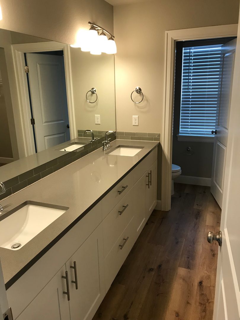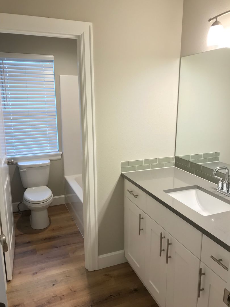 The primary bedroom opens to a bathroom with double sink vanity and large wardrobe closet. The other two cozy bedrooms share a bathroom with soaking tub. All bathrooms have modern and clean finishes of quartz countertops, tile backsplash and laminate wood flooring.