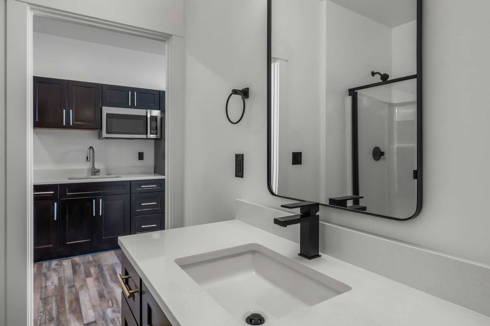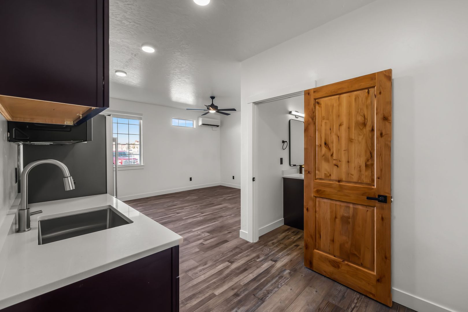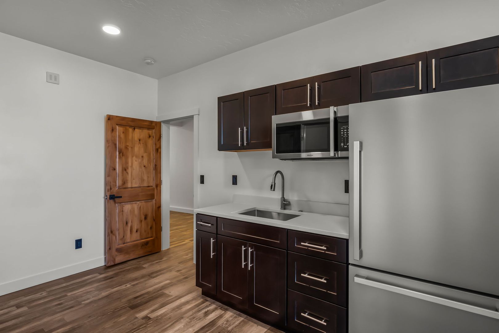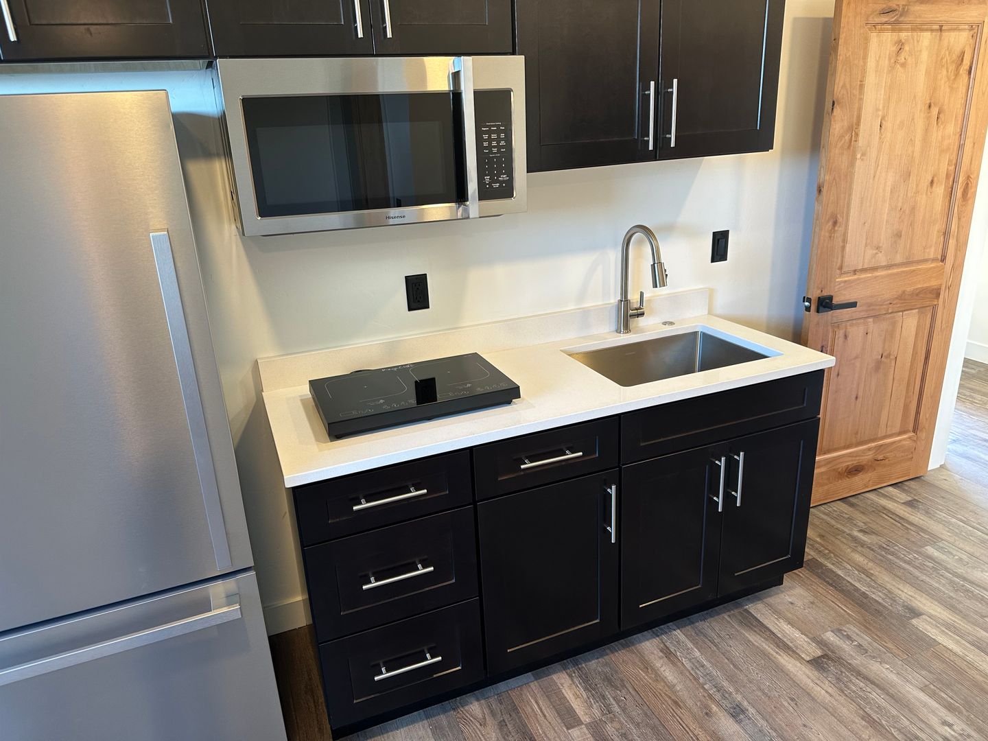 - Kitchenette equipped with a sink, fridge, and microwave.
